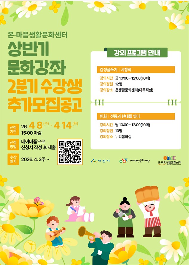 (재)아산문화재단에서 2026 온·생활문화센터 상반기 문화강좌(2분기) 수강생을 추가 모집합니다.