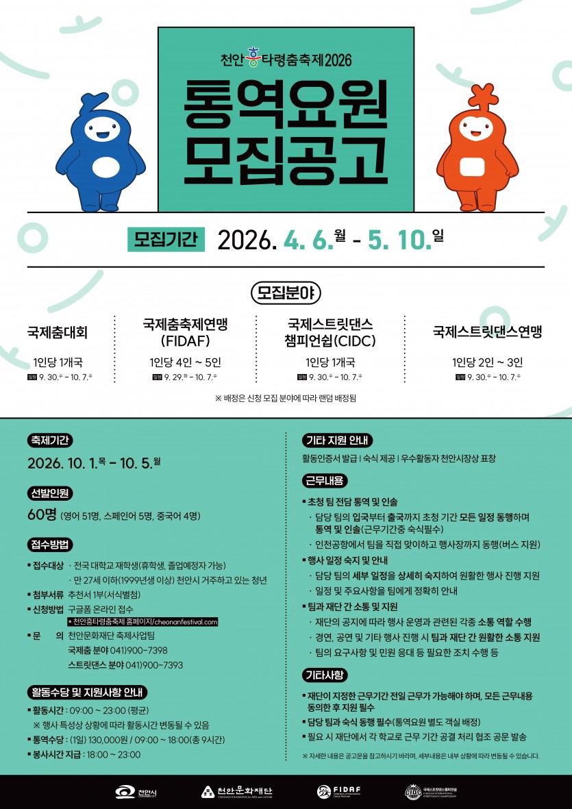 [천안문화재단] [2026-50호] 천안흥타령춤축제 2026 통역요원 모집 공고