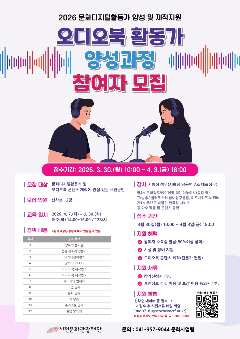 재단법인 서천문화관광재단에서는 문화디지털활동가 양성 및 제작지원을 통해 서천군민의 디지털 콘텐츠 제작 역량을 강화하고 지역 문화콘텐츠 활성화에 기여하고자 「오디오북 활동가 양성과정」 참여자를 아래와 같이 모집하오니 많은 관심과 참여 바랍니다.