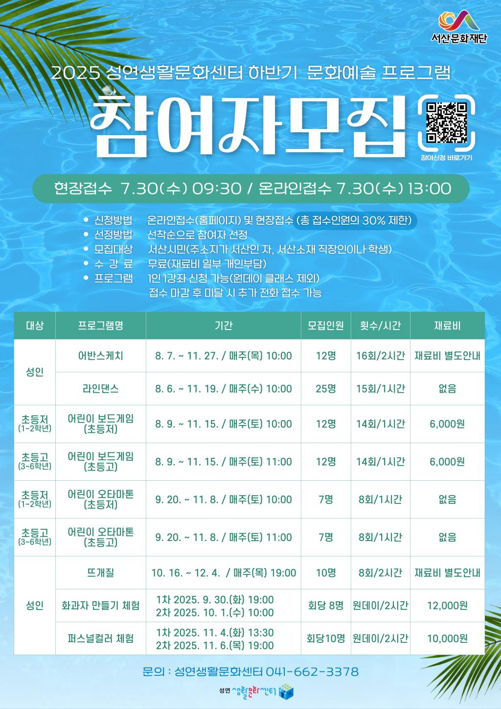 [참여자모집] 2025년 성연생활문화센터 하반기 문화예술 프로그램 참여자 모집