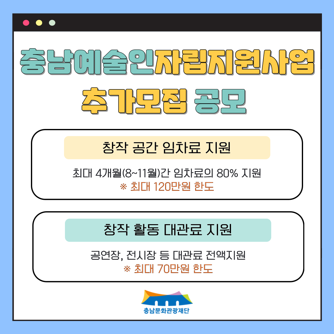 충남문화관광재단이 2025 충남 예술인 자립지원사업 추가모집공모를 시작합니다!