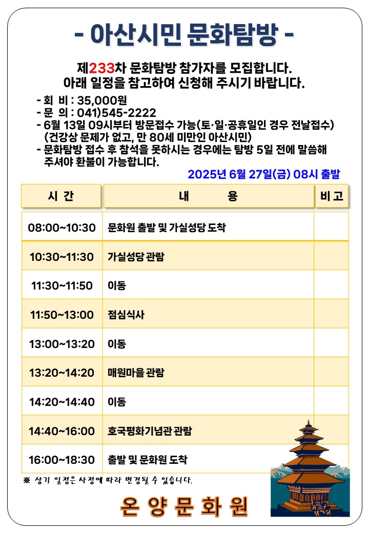 제233차 아산시민 문화탐방 참가자를 모집합니다.