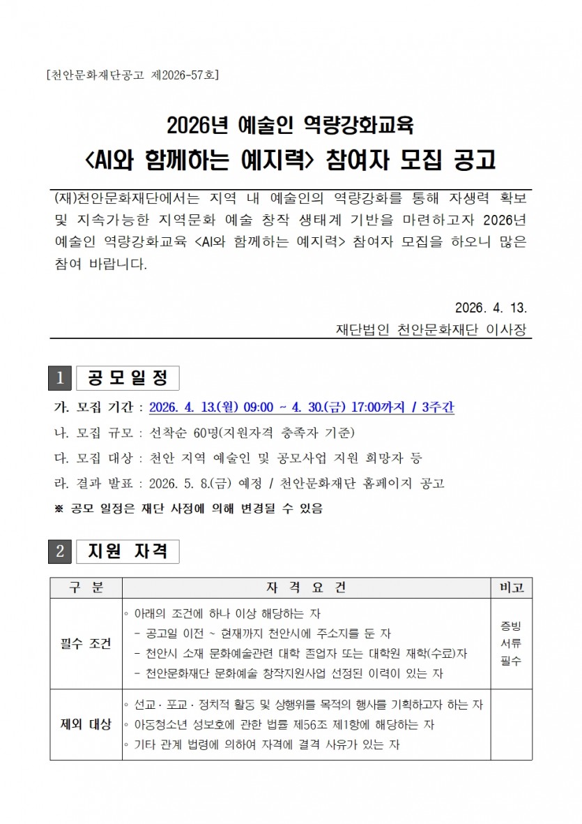 [천안문화재단] [2026-57호]2026년 예술인 역량강화교육 <AI와 함께하는 예.지.력.> 참여자 모집 공고