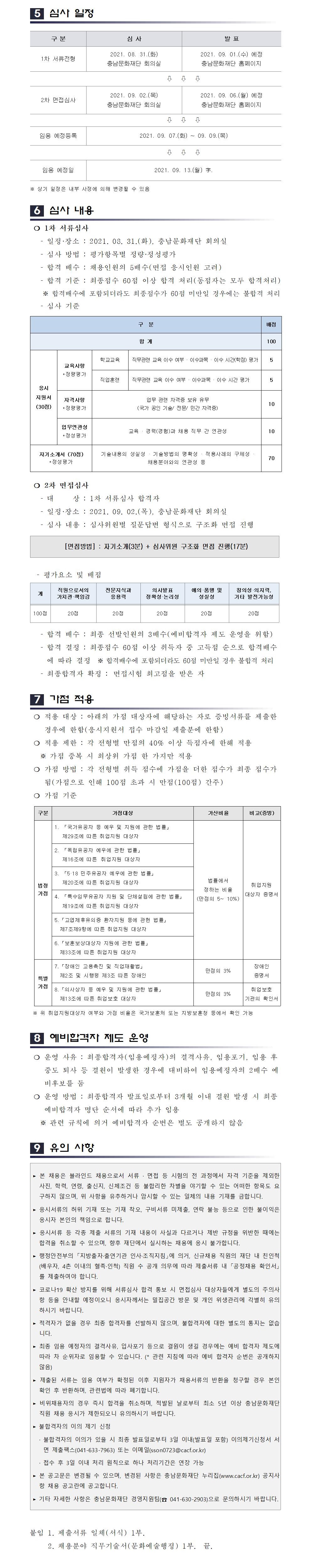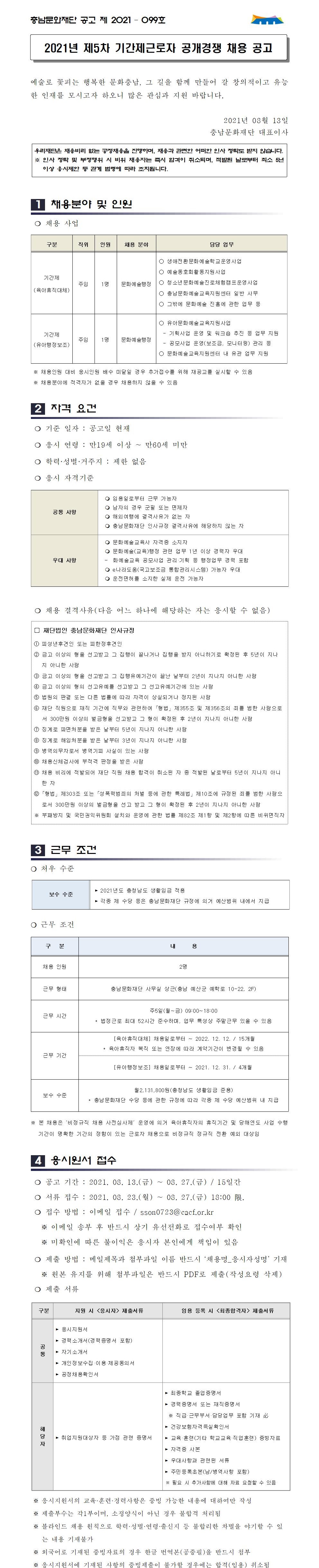 | 열람중 | 충남문화재단 | 2021년 제5차 기간제근로자 공개경쟁 채용 공고 | 2021-08-13 10:40:52 | 2021-08-27 18:00:00 | 207 |