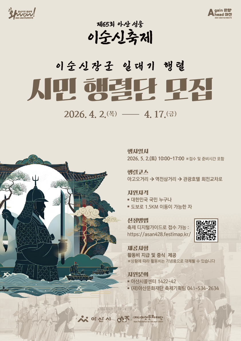 (재)아산문화재단에서는 <제65회 아산 성웅 이순신축제>의 이순신 장군 일대기 행렬 주요 역할 선발을 통해 시민이 직접 참여하고, 주인공이 되는축제를 만들고자 합니다. 다음과 같이 이순신 장군일대기 행렬의 시민 행렬단을 모집하오니 많은 관심과 참여 부탁드립니다.